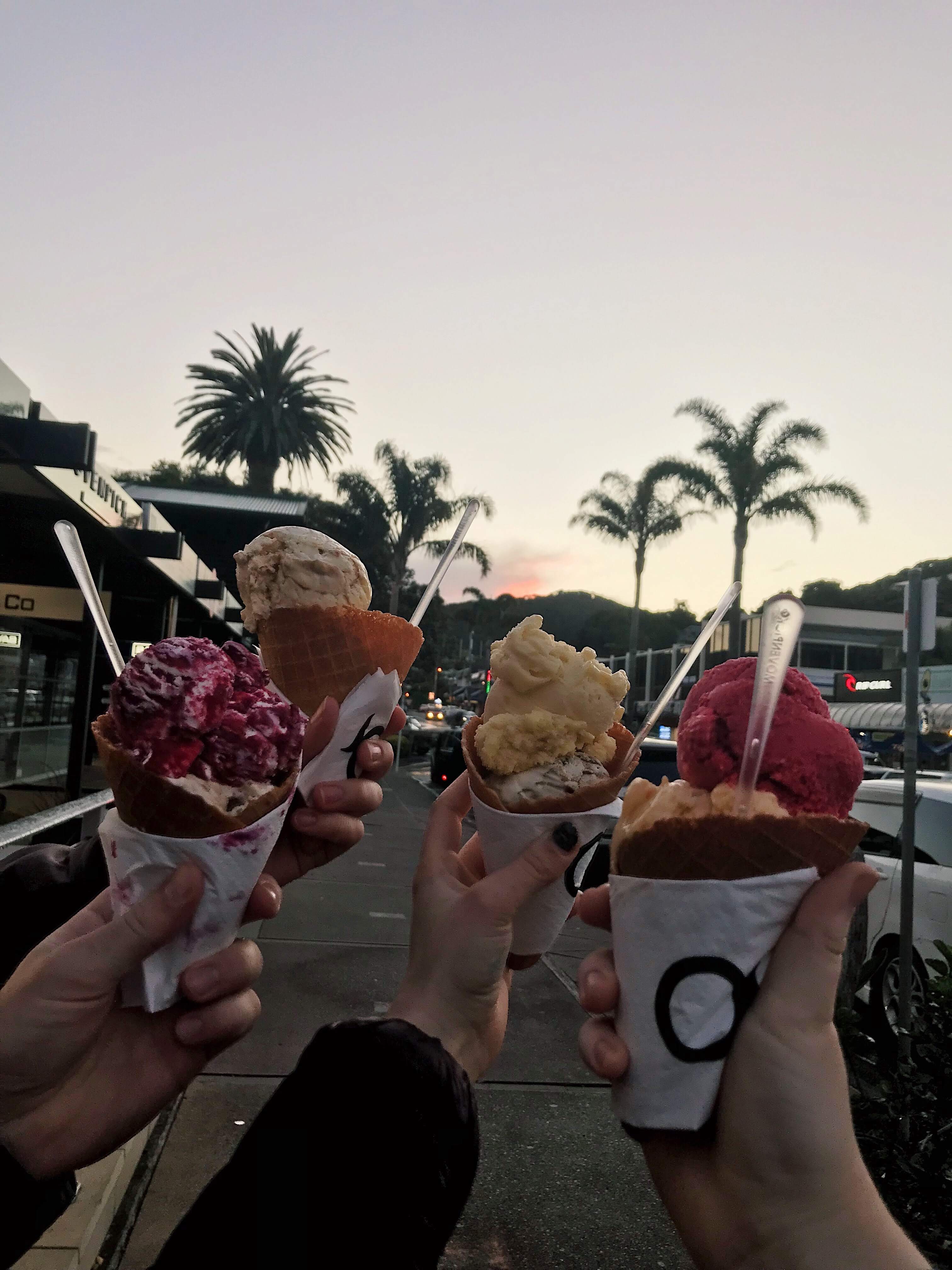After a brief stop at Whangarei (pronounced “fang-a-ray”) Falls, we checked into our beachy hostel in Paihia, a small coastal town that is much more my speed than downtown Auckland. We explored an arts and crafts fair in the park, rented kayaks for two hours with a group of 7, enjoyed a steak barbeque at our hostel, and grabbed the most delicious ice cream at a Swiss ice cream shop.