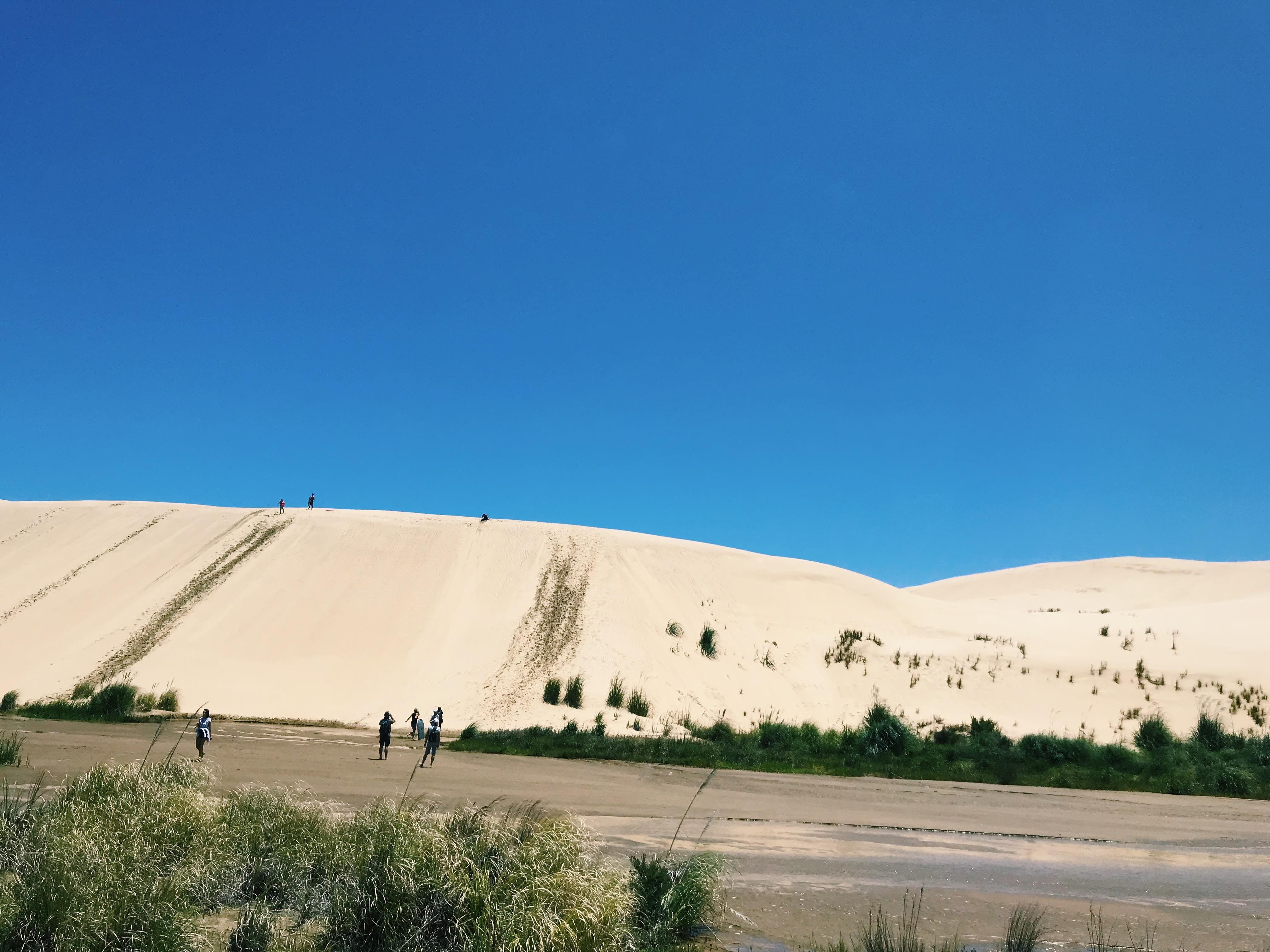 At Te Paki Stream, our bus hopped off of the gravel road and onto a sandy streambed next to towering sand dunes. We hopped off of the bus in our bare feet, grabbed a foam board from the rear bus bay, and started charging and trudging up the sand dune to try out sandboarding. It was a blast! What wouldn’t be fun about flying headfirst down a sandy hill using your toes as brakes as you splash into the water puddles at the bottom?