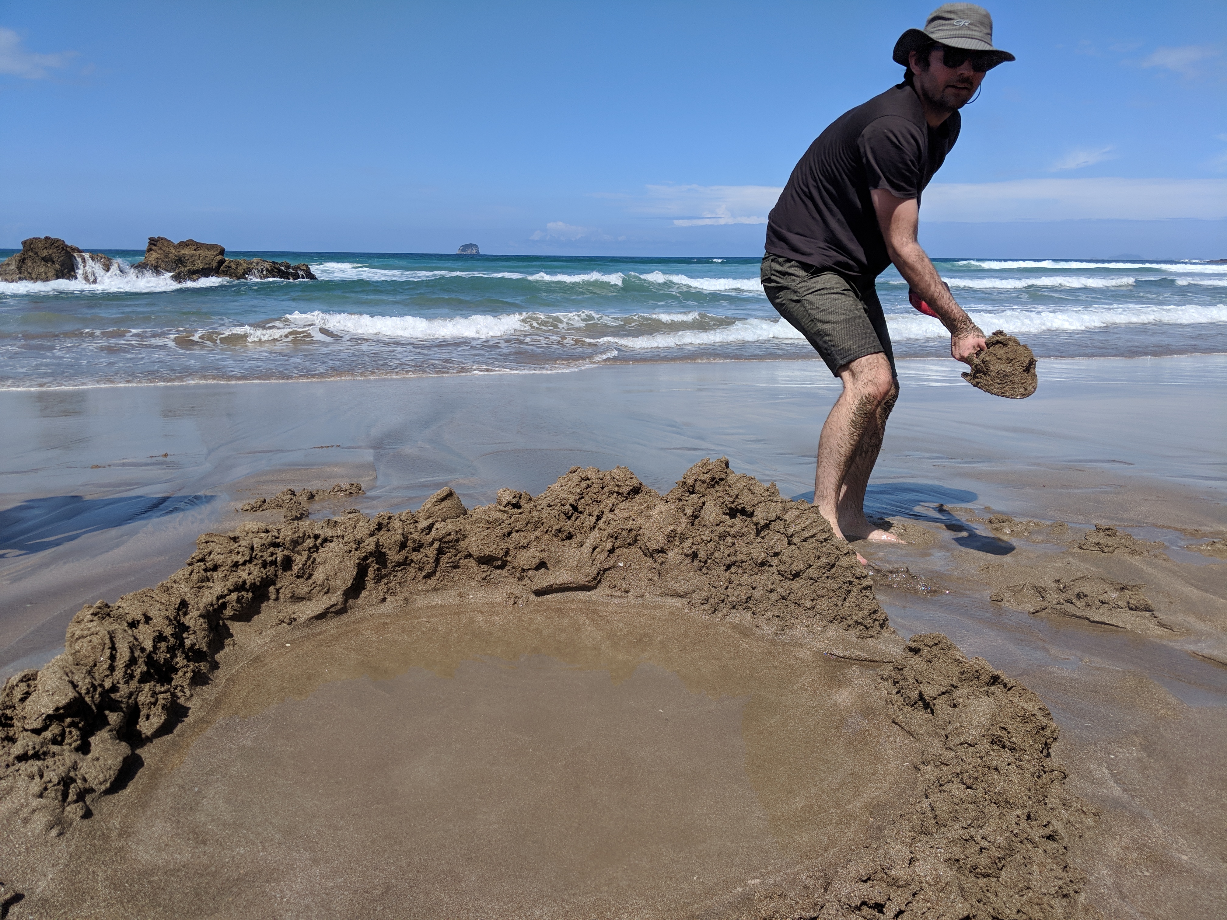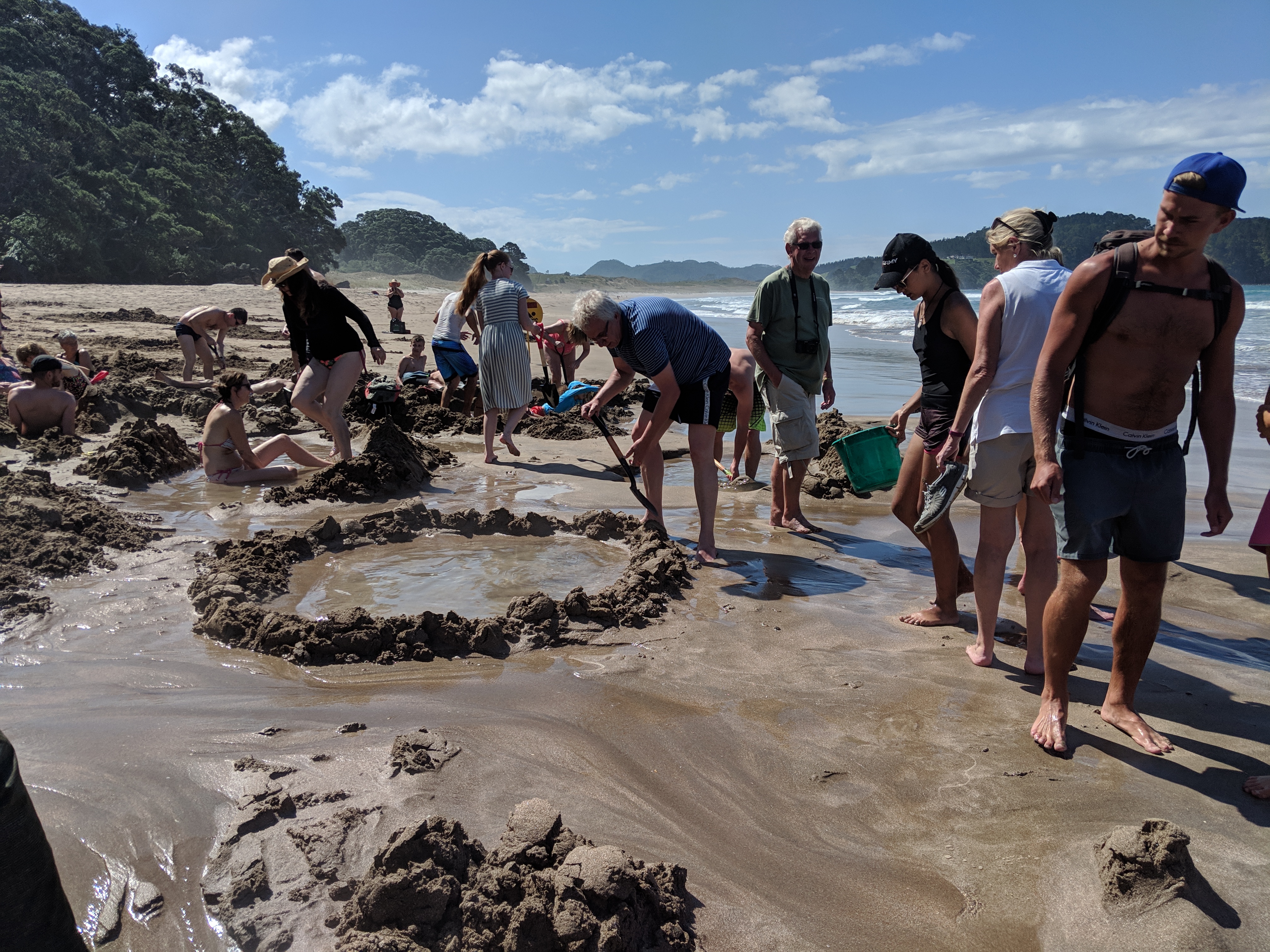 Hot Water Beach is a self-defined attraction that gets busy every day around low tide. Geothermal activity underground heats freshwater (up to 147 degrees Fahrenheit!) that can seep to the surface—if you dig for it.  We rented a spade for $5 at the local cafe and walked out to the spot on the beach the waitress had pointed out to us. There was already a crowd of people around, digging and sitting in the sand. After two tries at digging pools, but only turning up cold water, a local showed us how to dig our feet into the sand a few inches and feel for the warm water below. If the water was still cold, then we looked for a different spot before digging. It wasn’t long before we had a pool long enough for us both to sit in, with sand walls built all around to keep out the still-present ocean waves.
