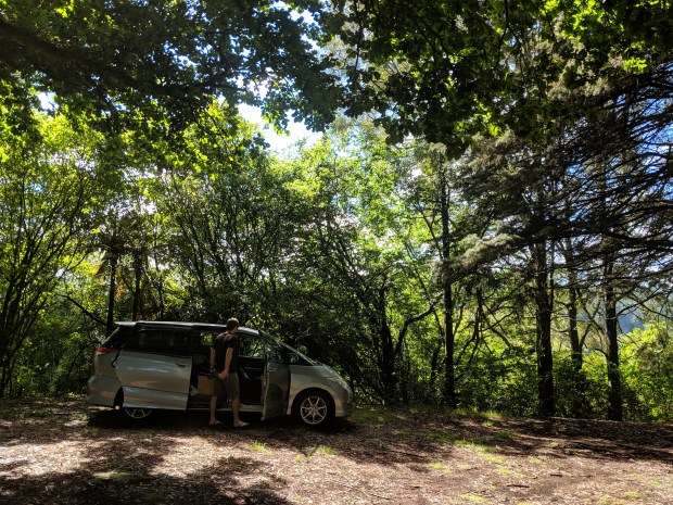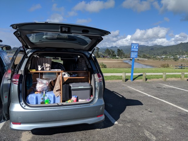 In New Zealand campervan lingo, “self-contained” means that campers are not making an impact on the environment because their van is able to take care of all their needs. Self-contained vans have a bed, a freshwater tank, a sink that leads to a grey water tank, and a toilet (which in our case will only be used for emergencies). Having a self-contained certification allows campers to “freedom camp” around the country in sites that cost nothing but usually have a few parking spots and a nearby toilet. They can be anything from a car park to a spot by the beach—and we’ve found some pretty gorgeous ones so far.