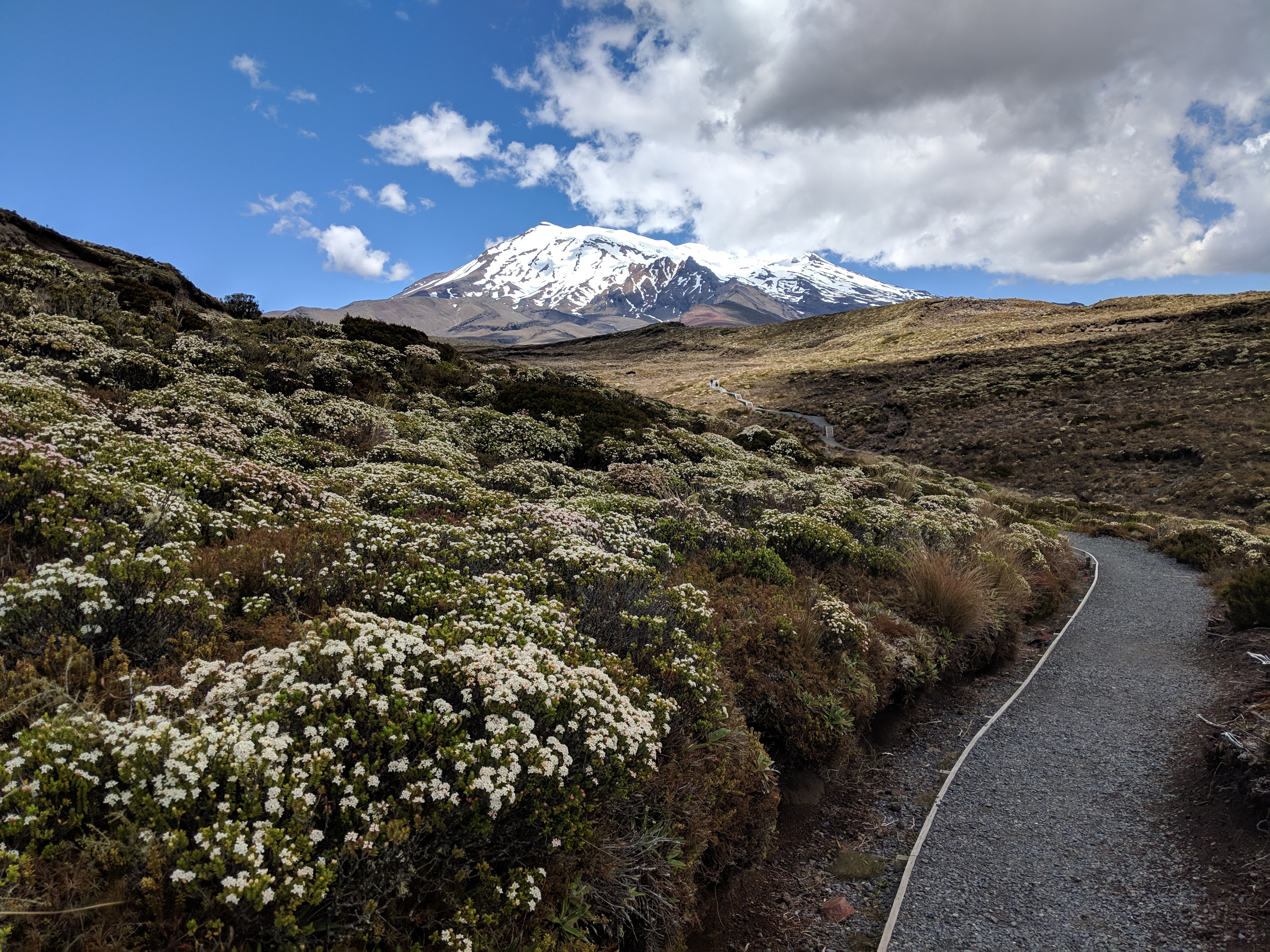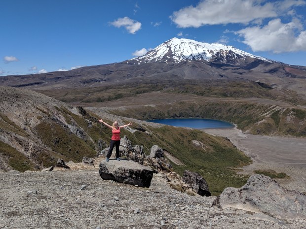 As we continued to climb out of the forest, we walked through grasses and flowering alpine shrubs, on footbridges and over wooden staircases, always under the watch of Ngauruhoe. We finally made it Lower and Upper Tama Lakes, ten-thousand-year-old craters that filled with water and are still clear and clean today. There is even a native liverwort that can only be found here on the North Island!
